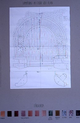 'Foton, teckningar och modeller av studenter från Chalmers Tekniska högskola, Institutionen för Arkitekturhistoria, Göteborg. Foton och teckningar av detaljer från Naturhistoriska museets byggader, byggnadsvård. :: Uppmätning av fasad och plan. Ritning av porten. :: :: Ingår i serie med fotonr. 6929:1-21.'