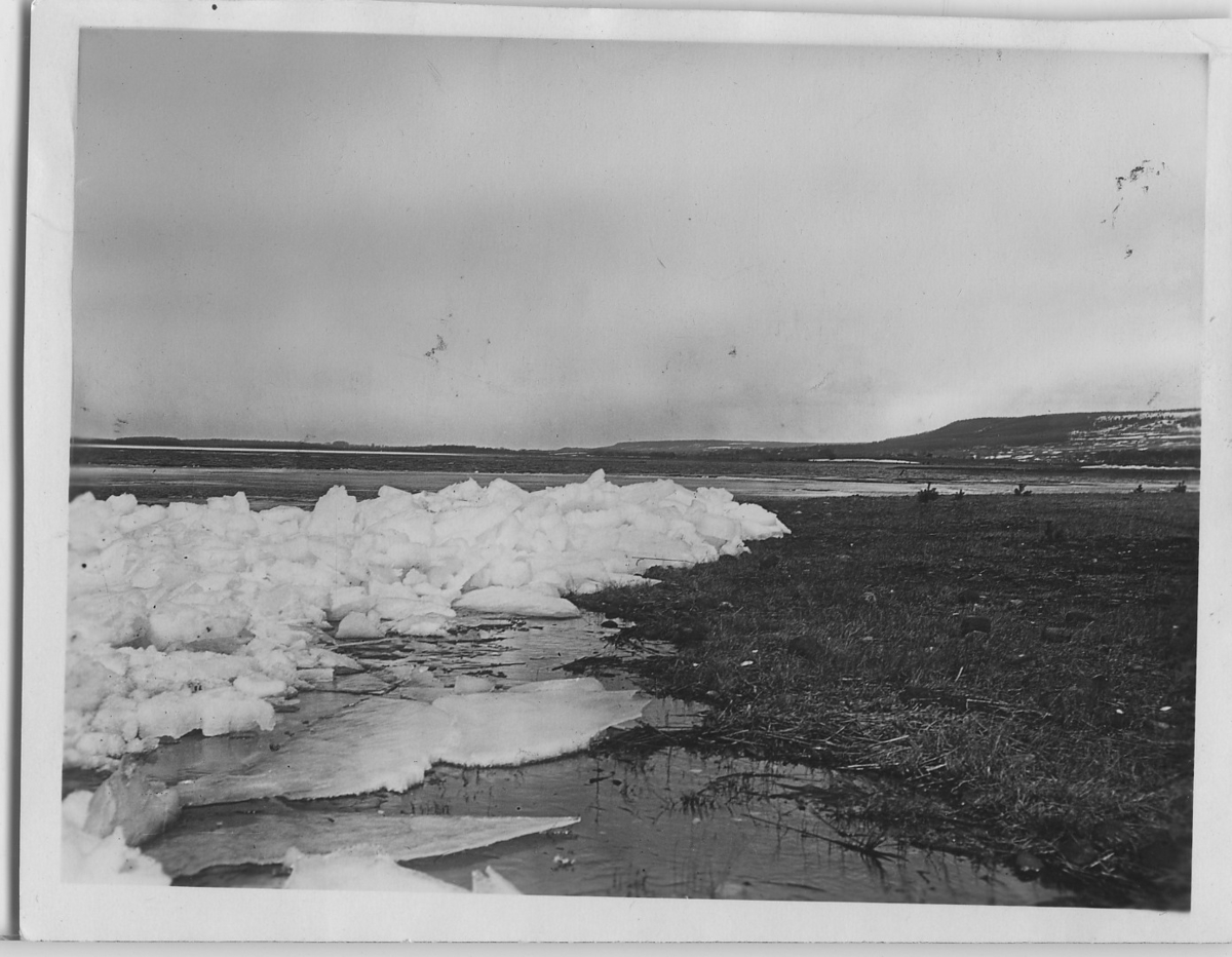 'Bilder från Hornborgasjön från: R. Söderberg: '' Hornborgasjön och dess fornsjöområde'' Del I 1932. :: :: Enligt anteckning på baksidan: ''Billingen i bakgrunden. Efter islossningen i Hornbergasjön. Drivisackumulation efter sydvästlig ström på fågeludden.'' Sjösänkning. :: :: Ingår i serie med fotonr. 4245:1-35.'