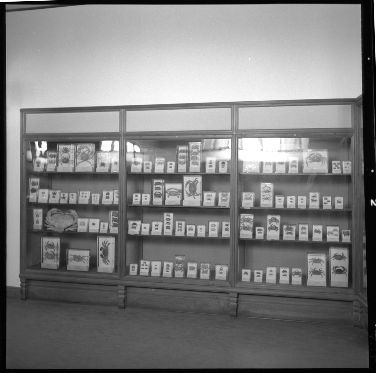 'Monterskåp med diverse preparat av leddjur, kräftdjur. :: :: Ingår i serie med fotonr. 7120 med diverse bilder från Hans Lohmander.'