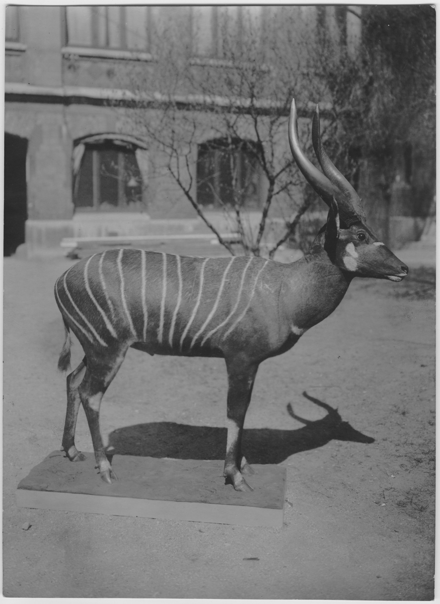 'Bongoantilop, hane, stående på gården. På gården utanför muséet. Coll.an. 3956. :: :: Står utställd i däggdjurssalen på Göteborgs Naturhistoriska Museum (2007).'