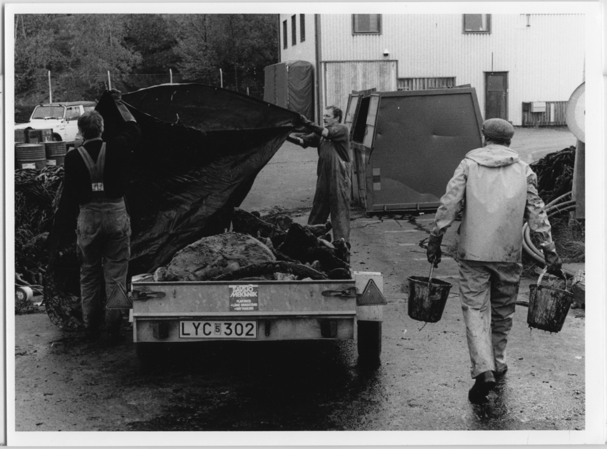 'Skelettering :: :: Omhändertagandet av vikvalen, Nya Varvet. Flera personer från museet arbetar med valen: :: :: Ulf Larsson (till höger) och Roland Gardtman med presenning vid släpkärra med vikvalen. Åke Melin, iklädd keps, (ryggtavlan) med 2 hinkar. :: :: Ingår i serie med fotonr. 6729:1-18.'
