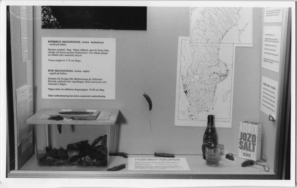 'Utställningsmonter om rödbrun och röd skogssnigel. Monterrubrik ''Ännu en rödbrun snigel. . .'' Tillkom hösten 1991 som tillfällig utställningsmonter. :: :: Ingår i serie med fotonr. 6762:1-29 med bilder till årstryck 1991-1993.'