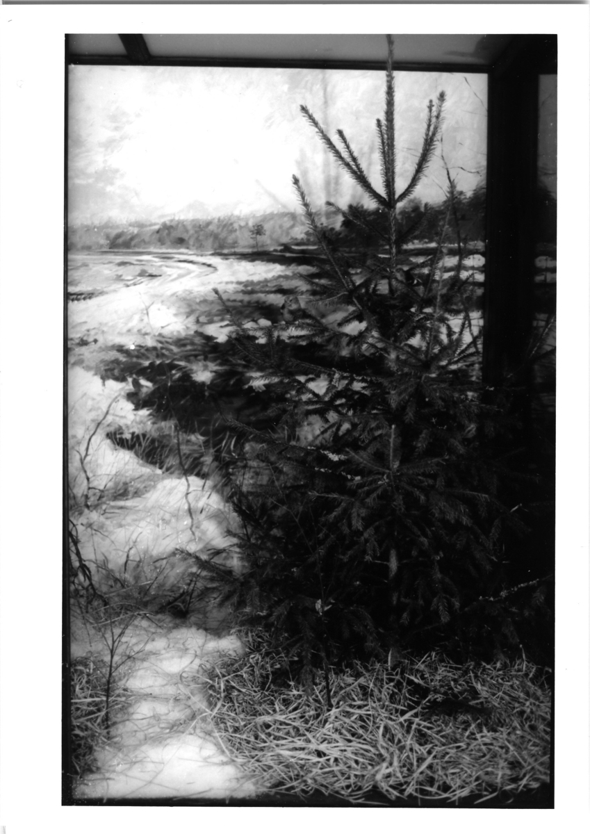 'Fågelmontern med Göran Dalhovs bakgrundsmålning på Göteborgs Naturhistoriska Museum. I granen sitter citronfjäril nertill och en bändelkorsnäbb upptill. :: :: Monter nr 139 år 2006. :: :: Ingår i serie med fotonr. 6764:1-39.'