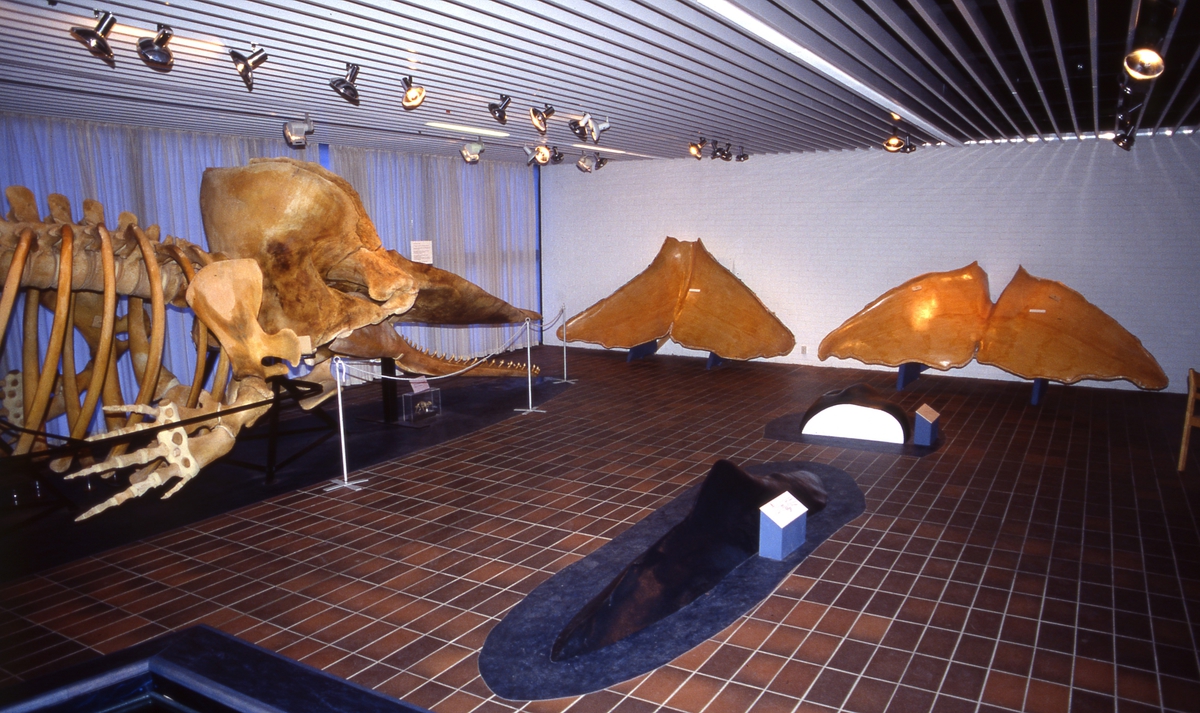 'Del av kaskelotuställningen med skelettet av kaskeloten till vänster. Modeller av valstjärtar. :: :: Ingår i serie med fotonr. 6668:1-10 med foton från Kaskelotutställningen.'