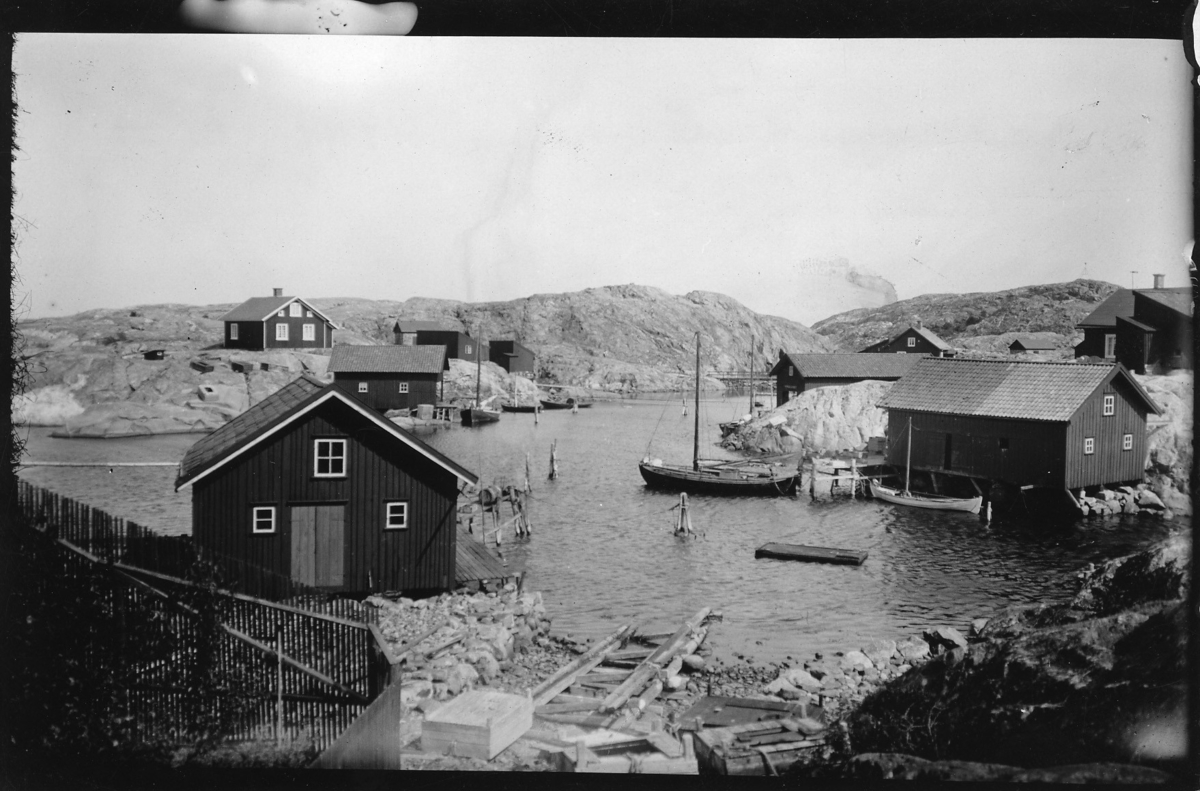 'Hamnen från väster, knappt 10 träbyggnader. Trähus på kala berghällar. Ca 5 båtar synliga. Små trälådor liggande spridda på hällar ner mot vattnet. Trästaket. :: :: Ingår i serie med fotonr. 665-672.'