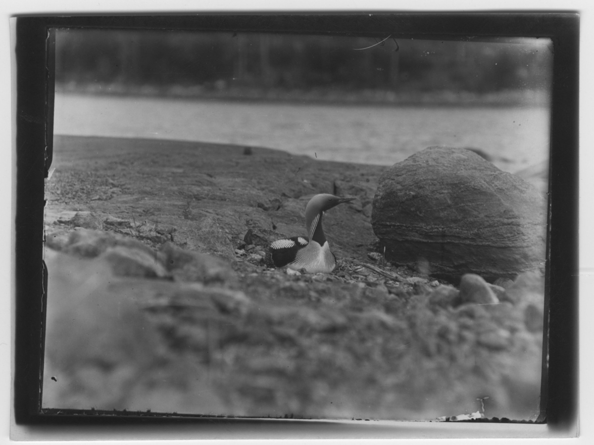 'Storlom ipå boet nvid stenblock på berghäll. :: :: Ingår i serie med fotonr. 1232-1246.'