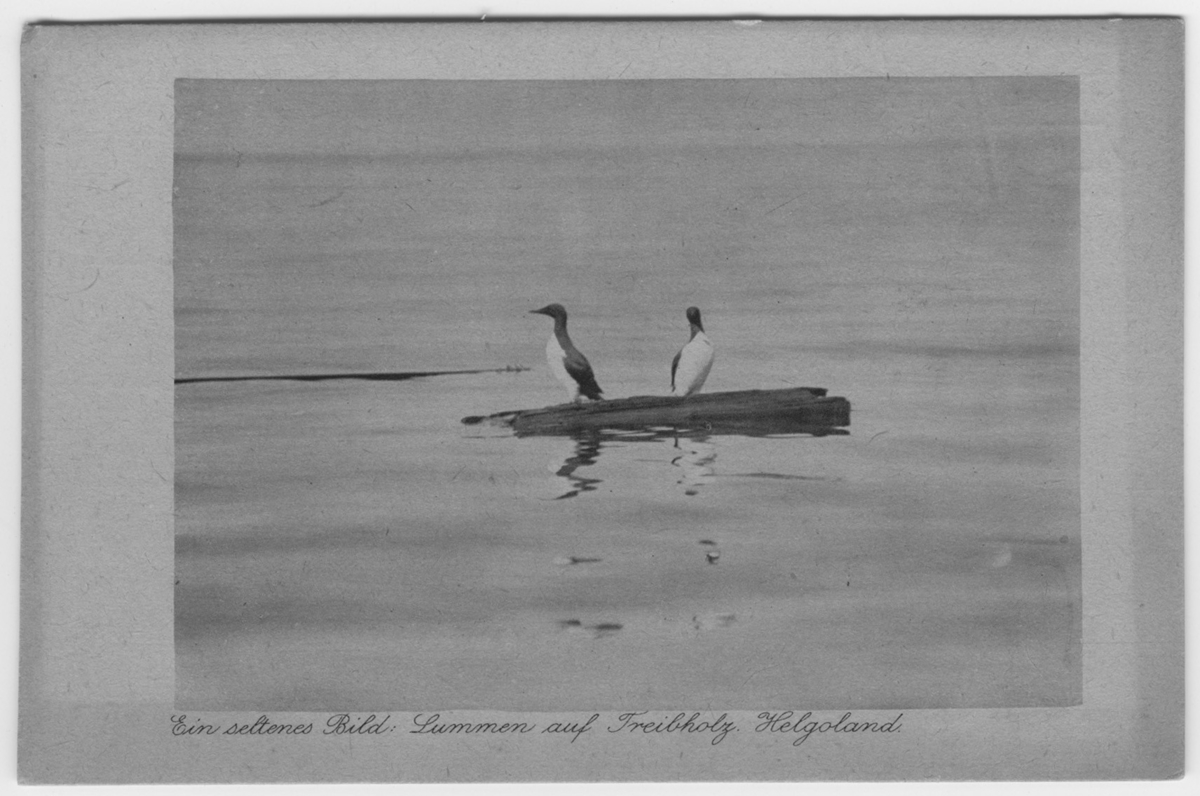 'Sillgrisslor, 2 st fåglar på drivved i vatten. Tysk text på fotot. :: :: Ingår i serie med fotonr. 1201-1220.'