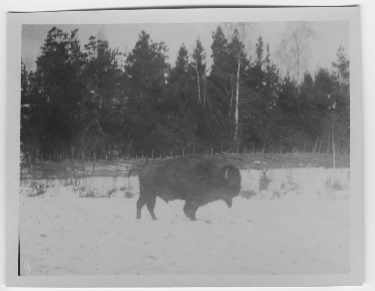 'Amerikansk bison, hane, på äng, sedd från sidan.Trästaket. Granskog. Snö :: :: Ingår i serie med fotonr. 780-785.'