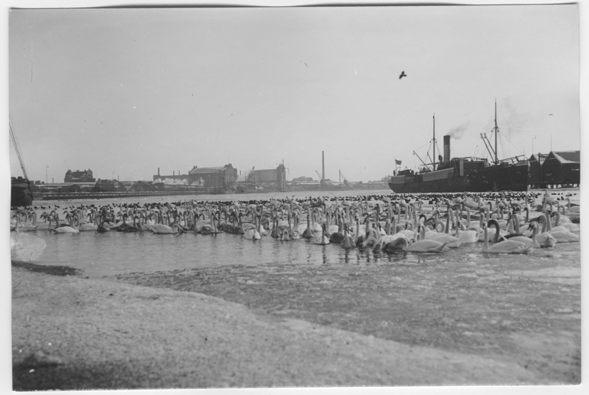'Svanar i Landskrona hamn, stor flock i öppet vatten med isflak omkring. I bakgrunden större båtar, byggnader pch brygga. :: :: Se fotonr. 1358-1368, 1430, 2544-2545 samt 945-950, samma motiv samma år.'