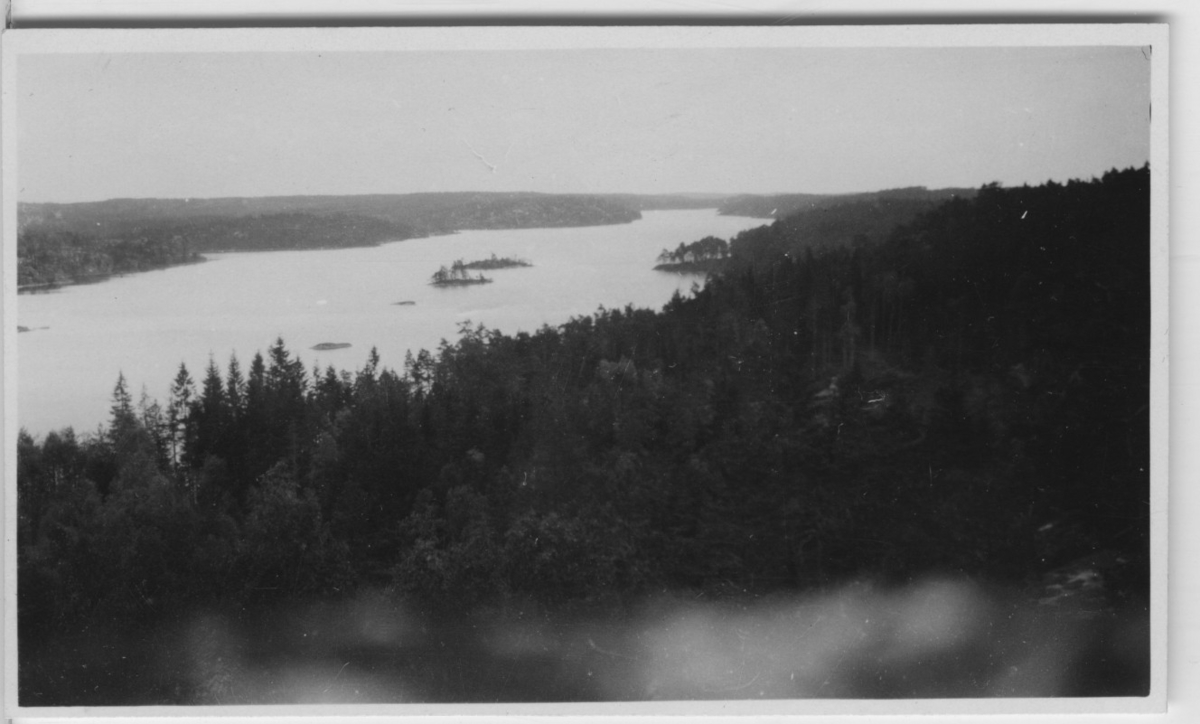 'Göteborgs Biologiska föreningens utfärd till Bullaren: :: :: Vy över barrskog och sjö med små öar. :: :: Ingår i serie med fotonr. 2088-2096.'
