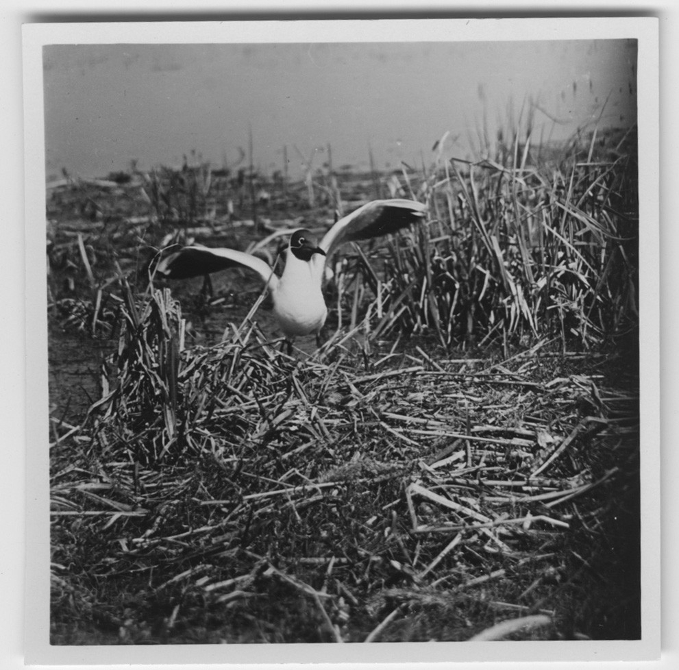 'Skrattmås, landar på boet i vassen. :: Text på baksidan: ''Skrattmåsen slår ner en bit ifrån boet och går sedan fram till ägget. Detta bo låg sex meter från det fotograferade tärnboet och gömslet byggdes mitt emellan.'' :: :: Ingår i serie med fotonr. 2305-2346.'