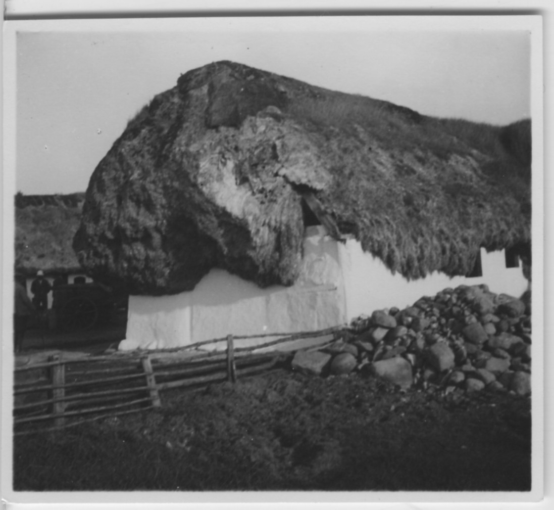 'Biologiska föreningens utfärd till Läsö och Nordre Rönner: :: :: Bangsbo gård, del av tak, halmklätt?. Staket och stenblock i hög i förgrunden. :: :: Se fotonr. 2674-2734, 2687-2691, 2692-2711, 2714-2734, 2843-2863 och 2975 från samma utfärd.'