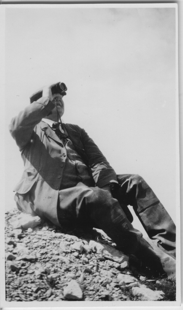 'Biologiska föreningens utfärd till Öland: :: :: Text enligt foto: ''Leonard Axel Jägerskiöld vid Knisa mosse.'' Sitter på marken med en kikare. :: :: Se även fotonr. 2607-2625, 2583-2606 samt 2883-2911 från samma utfärd.'