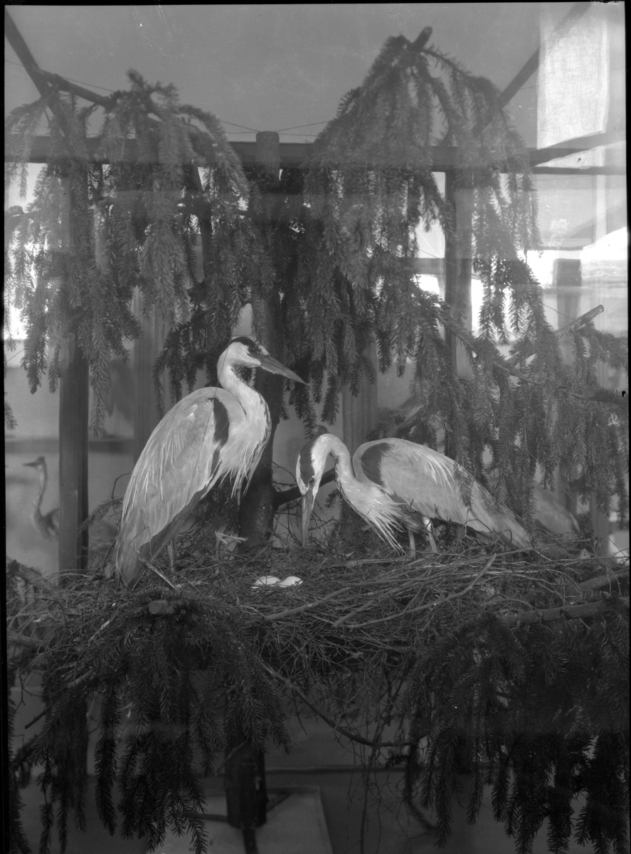 'Biologisk grupp med 2 hägrar, hane och hona, på boet med ägg. Monterade i gran. Boet från Trolleholm, Skåne. Fåglarna från Snogeholm, Skåne. :: :: Gen.kat.nr. 1913-2341 och 1913-2342. Av.su. 3923 och 3924. :: :: Gruppen utställd i monterskåp nr. 210 i fågelgången på Göteborgs Naturhistoriska Museum (2007-11-01). :: :: Ingår i serie med fotonr. 2735-2769.'
