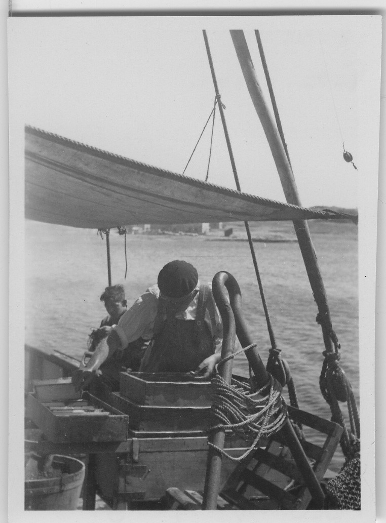'Naturhistoriska museets Skandiaexpedition 1935: :: :: 2 män på båtdäck, den ena arbetar vid sållen (ev. Dr Hugo Oldevig) :: :: Ingår i serie med fotonr. 3487-3494. Se även fotonr. 3482-3486. Se även fotonr. 3441:1-14.'