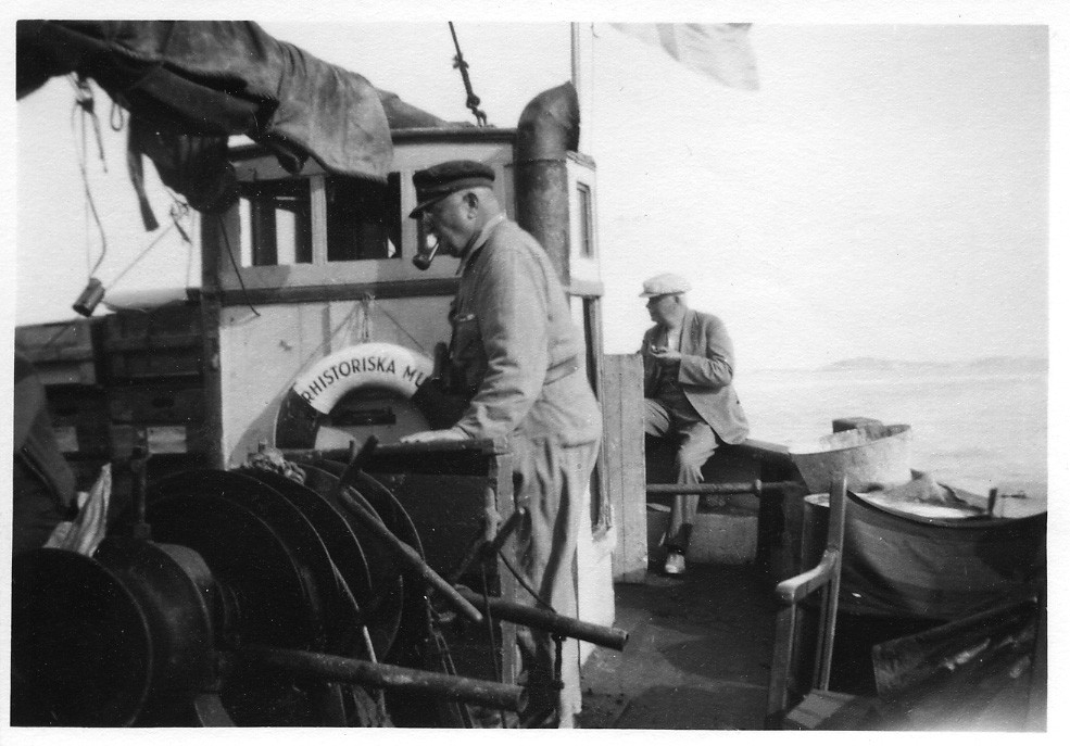 'Skandia expeditionen 1935: :: :: 2 män, Professor Leonard Axel Jägerskiöld (främst) samt yterligare 1 man ombord på Skandias däck. Anteckning på baksidan av fotografiet: Båten ''Skandia under gång från station, Saunerlikt[?] i svenska[?] vatten, nu är flaggan hissad''. Livboj hänger på vägg med texten ''Naturhistorska museet. :: :: Ingår i serie med fotonr. 3441-3452.'