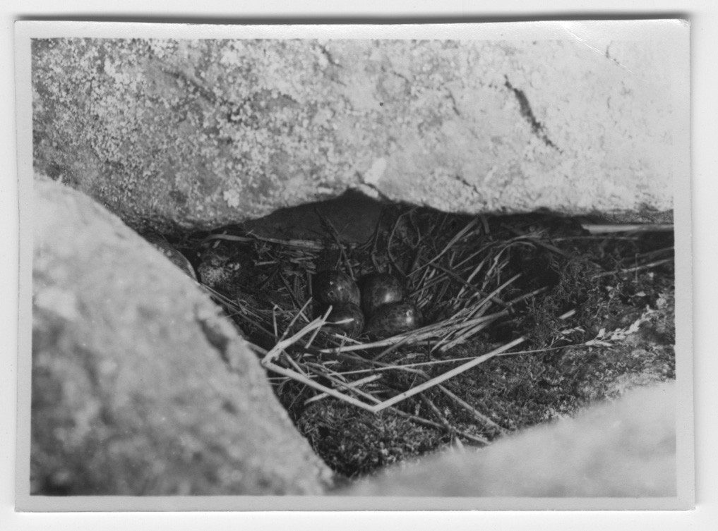 'Bo med 4 ägg av roskarl i bergskreva. :: :: Se serie med fotonr. 3466-3476.'