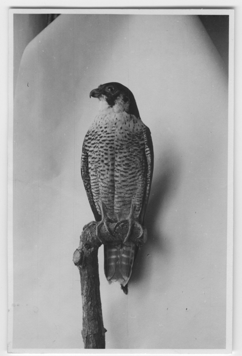 'Pilgrimsfalk, ringmärkt, monterad på gren. :: :: Ringmärkt 23137D Göteborg, Sweden vid Susegården, Kvibille socken, Halland 1934-06-14, skjuten 1935-10-10 vid Braadegaard, Braade, Nykjöbing, Själland, Danmark. :: :: Se fotonr. 3523-3526.'