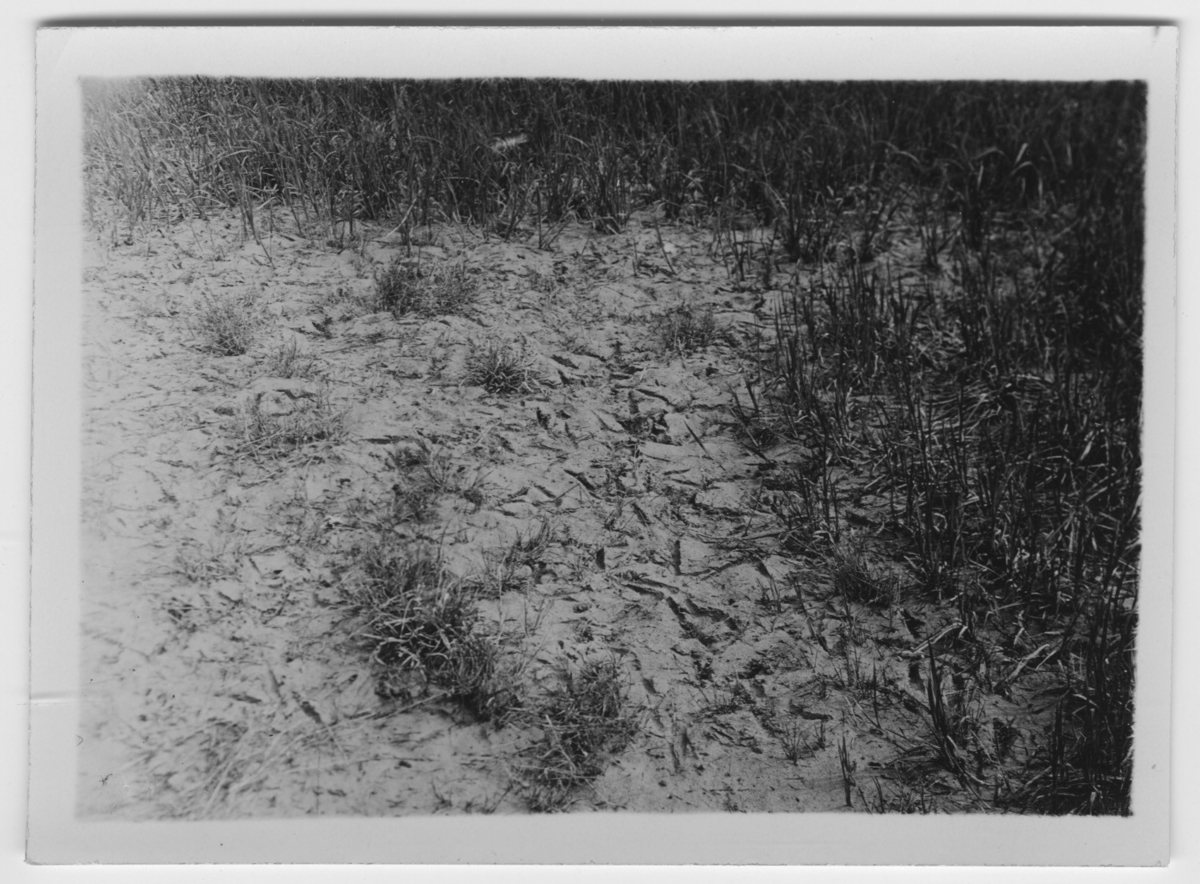 'Trantraj, spår, på bleket på Hornborgasjöns botten. Text på baksidan: ''Tranors traj på bleket på Hornborgasjönns botten.'' :: :: Ingår i serie med fotonr. 4102-4109.'