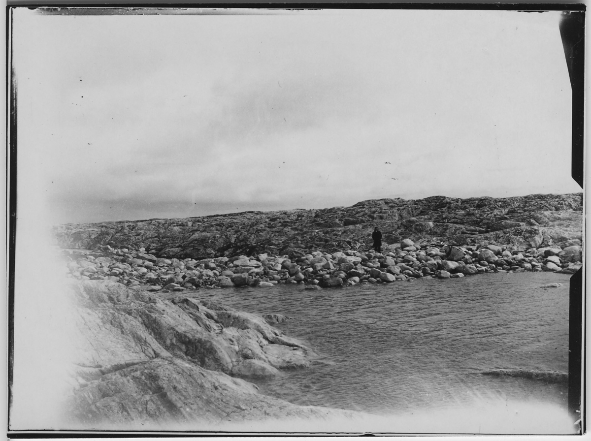 'Moräner på Svalbaren. Moränblock liggande nedanför berghäll ner mot havet. 1 man stående på stenblocken. :: :: Ingår i serie med fotonr. 3694-3719 se även fotonr. 3679-3693.'