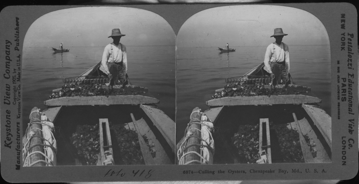 'Gallring av ostron. En man ombord i en eka med ostronfångst. I bakgrunden ytterliagre båt med person stående ombord. :: :: ''6874 - Culling the Oysters, Chesapeake Bay, Md., U.S.A.'' :: :: Ingår i serie med fotonr. 315-422. Se särskilt fotonr. 407 och 421.'