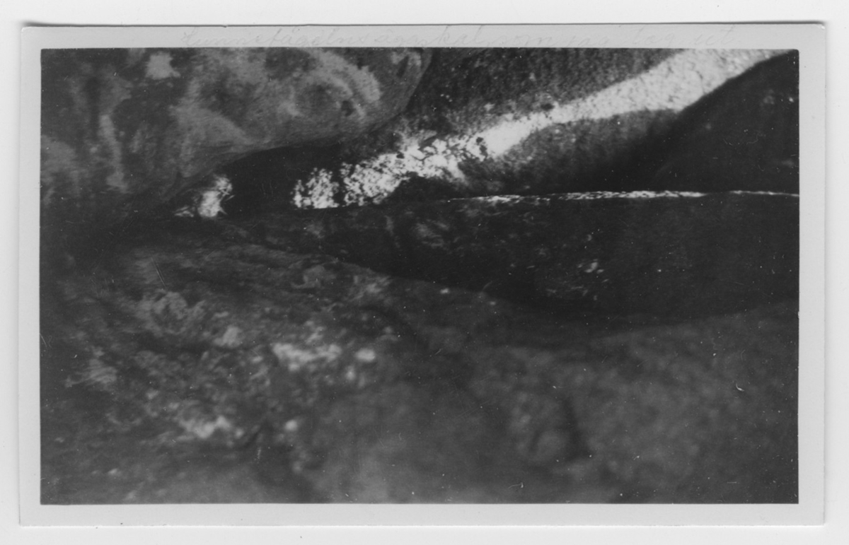 'Bergskreva där lunnefåglar har sina bohål. :: :: Text på baksidan av fotot: ''Lunnefågelns bohål. Det vita är exkrement. Den runda cirkeln visar, var jag fann lunnefågelns äggskal.'' :: :: Ingår i serie med fotonr. 4500:1-172.'