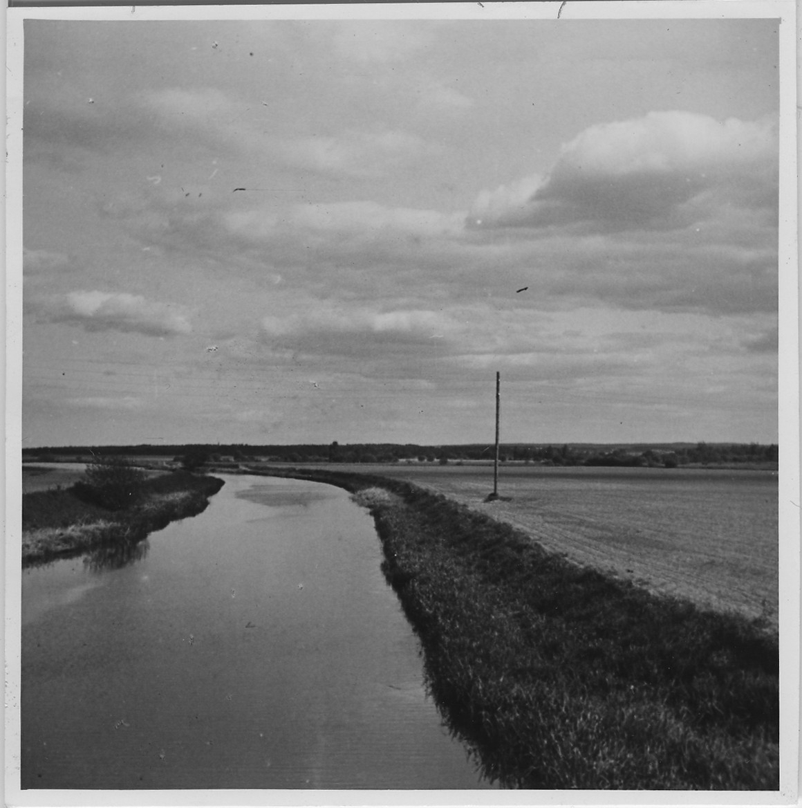 'Biologiska Föreningens utfärd till Oset och Kvismaren. :: :: Vy över vattendrag med åker vid sidan av. Enligt anteckning på baksidan av fotografiet:''Stora Kanalen i Kvismaren.'' :: :: Ingår i serie med fotonr. 4386:1-18.'