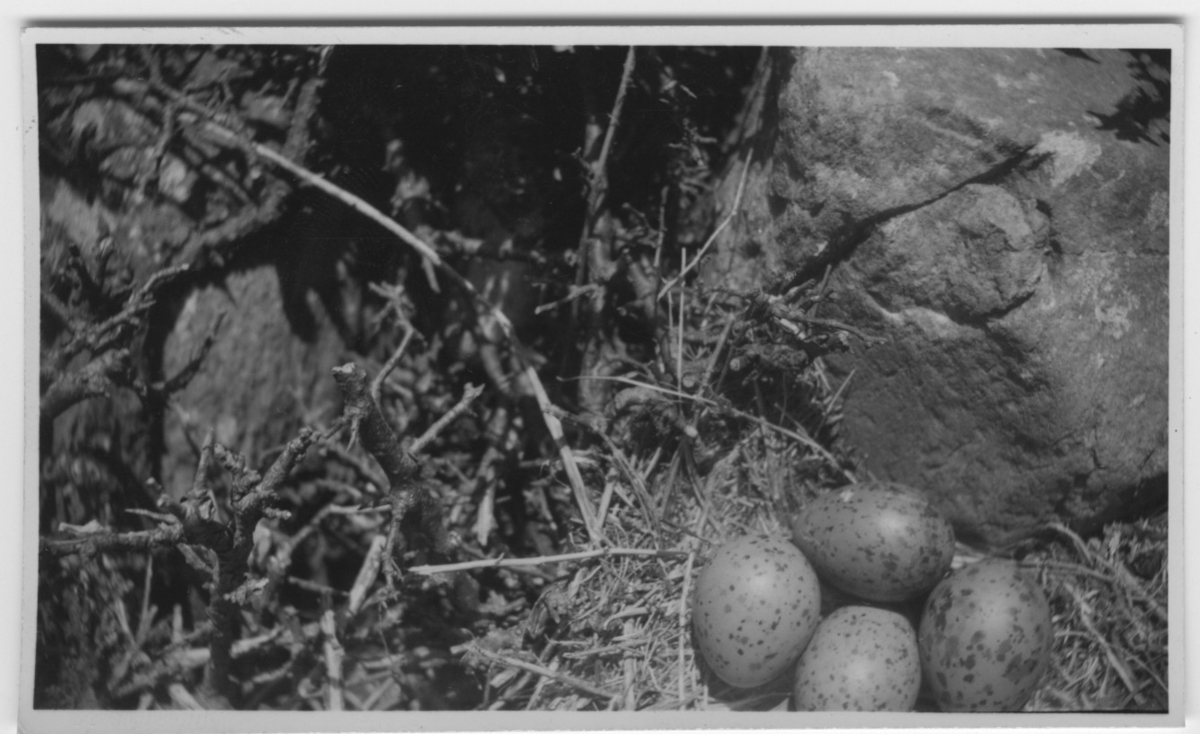 'Bo med 4 st fiskmåsägg invid stenblock. :: :: Text på baksidan av fotot: ''Fiskmåsens bo med 4 st ägg i en bergskreva på en udde.'' :: :: Ingår i serie med fotonr. 4500:1-172.'