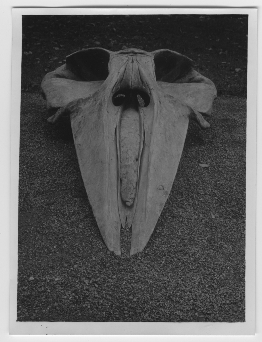 'Överskalle av vikval fångad i trål. Skallen ligger på grusgång (antagligen innergården på Göteborgs Naturhistoriska museum). Fynddatum: 1940-01-10. :: :: Se även 4373:2 samt 4188:1-2.'
