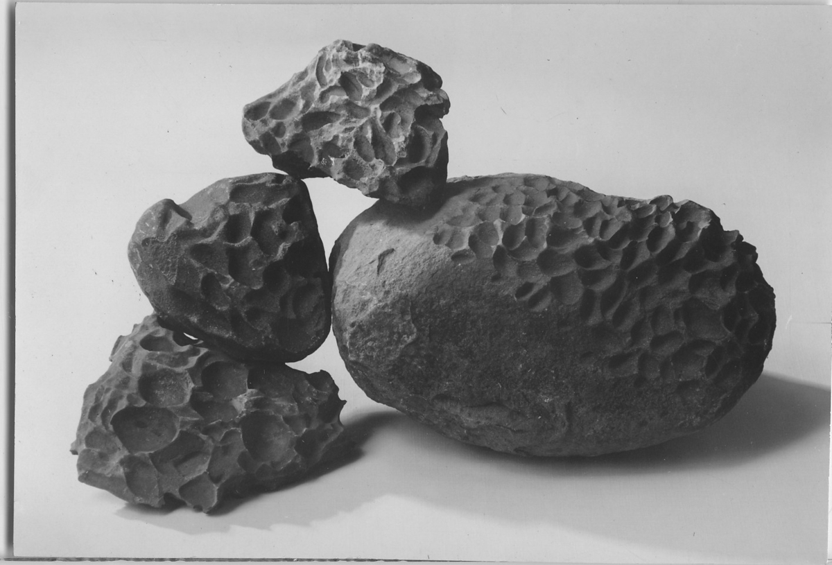 'Bilder från Hornborgasjön från: R. Söderberg: '' Hornborgasjön och dess fornsjöområde'' Del I 1932. :: :: Närbild på fyra sand- och kalkstenar fotograferade mot ljus bakgrund. Dessa har under organismers påverkan tillskansats, och visar så lösningsföreteelser. Sjösänkning. :: :: Ingår i serie med fotonr. 4245:1-35.'