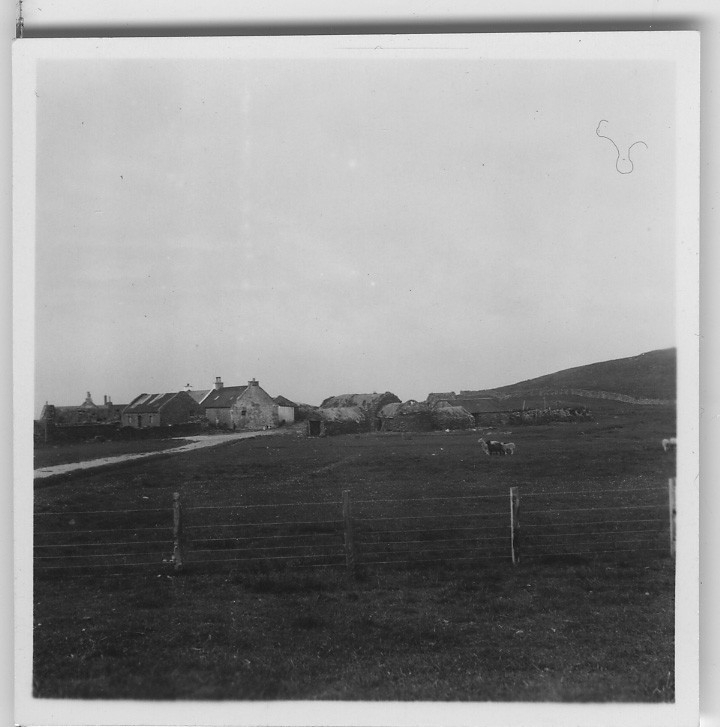'Från ''Skageraks''-expeditionen till Hebriderna och Shetland: :: :: Bindgård på ön Bressay, med stängsel i förgrunden, bakom dessa finns får och byggnader. :: :: Ingår i serie med fotonr. 4113:1-82.'