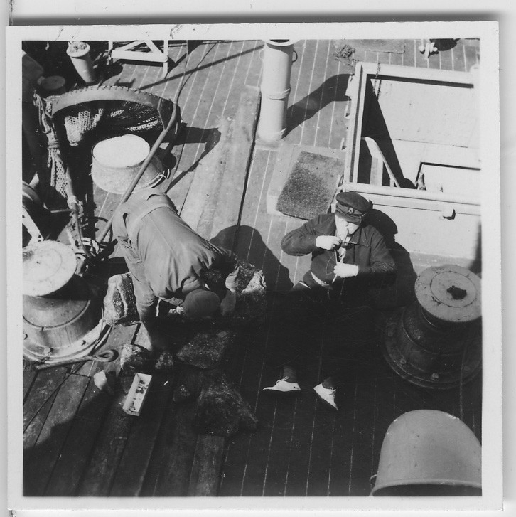 'Från ''Skageraks''-expeditionen till Hebriderna och Shetland: :: :: 2 män (Leonard Axel Jägerskiöld till höger) på Skageraks däck, en av männen tänder sin pipa den andra undersöker stenar. På båtdäcket även balja. :: :: Ingår i serie med fotonr. 4113:1-82.'