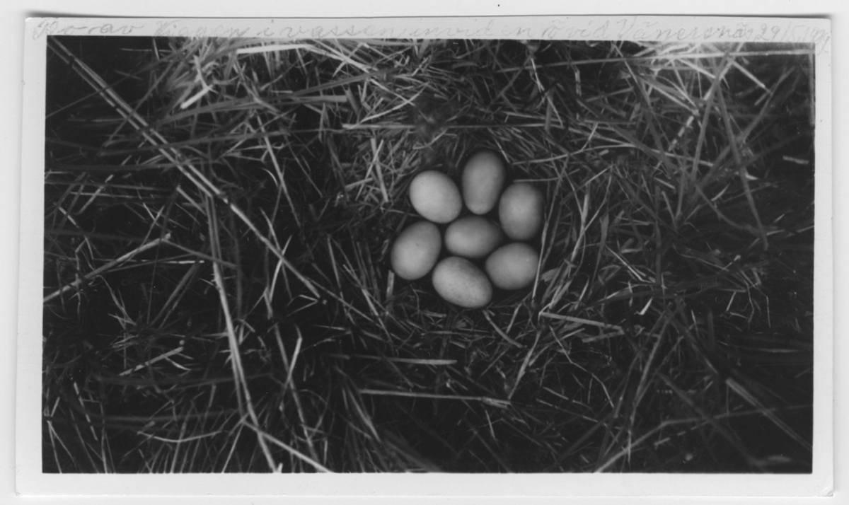 'Vigg, bo med 7 ägg. Text på fotot: ''Bo av viggen i vassen invid en ö vid Vänersnäs. :: :: Ingår i serie med fotonr. 4140-4158.'
