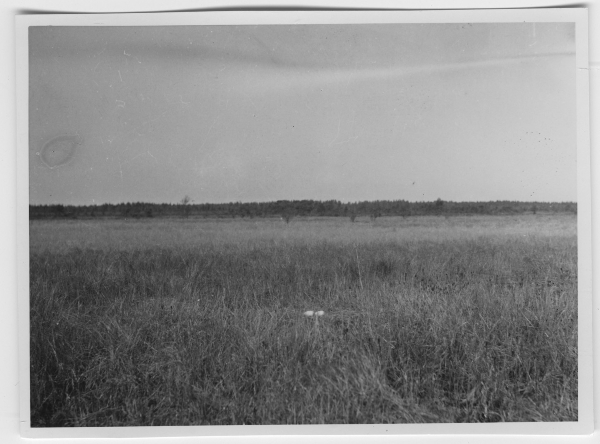 'Trana, bo med 2 ägg, på avstånd på öppen mossmark. Text på baksidan: ''Boet låg ca 100 meter från skogsbrynet utanför ''laggen''. :: :: Ingår i serie med fotonr. 4230-4234.'