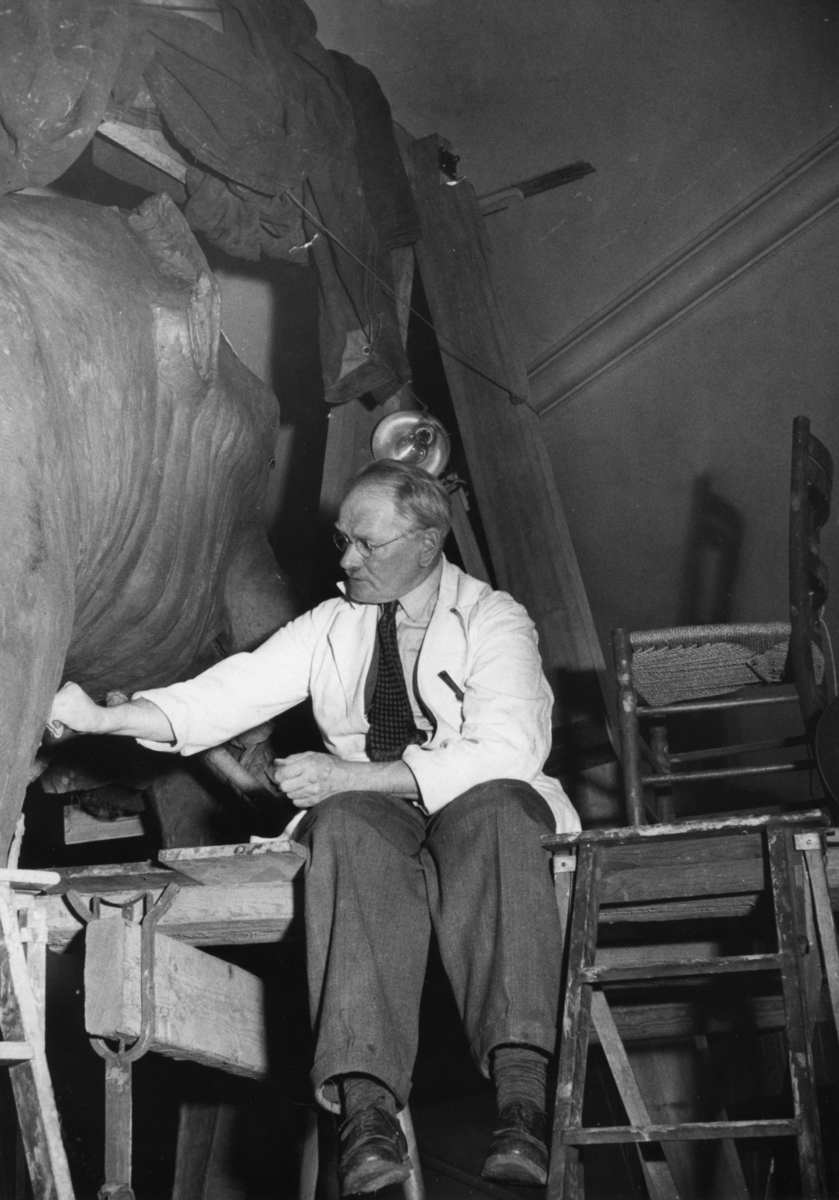 'Monteringen av Göteborgs Naturhistoriska museums elefant, från Angola. :: :: Grundstommen är lerklädd och lerformen bearbetas av konservator David Sjölander. :: :: Fynddatum: 1948-12-04. Elefanten skjuten och monterad av David Sjölander. :: :: Elefanten finns utställd på Göteborgs Naturhistoriska Museum i däggdjurssalen. :: :: Ingår i serie med fotonr. 4576:1-18.'