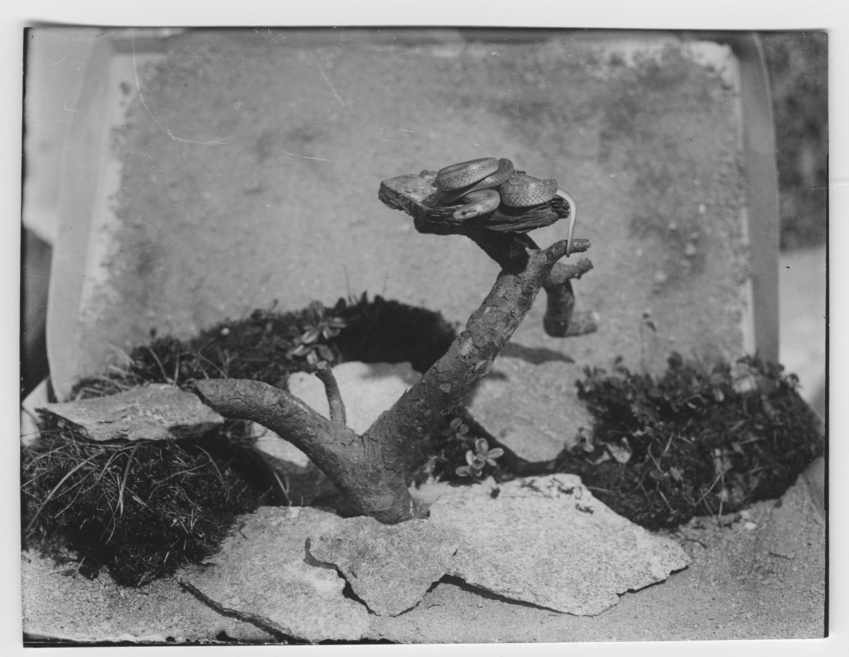 '1 eskulaporm, ligger ihopringlad i en gren. :: :: Ingår i serie med fotonr. 4501:1-60 ur ingenjör Otto Cyréns ''Ormar i fantasi och verklighet''. Bilden med på s. 153 i verket.'