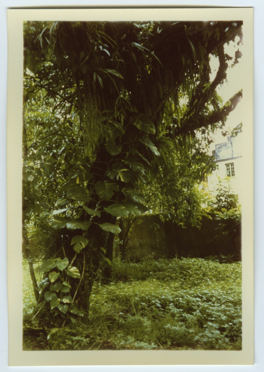 'Färgkopior efter diabilder tagna av Bengt Hubendick 1966 i Amazonas, ett par mil norr om Manaus i Beléms botaniska trädgård och på Trinidad: :: :: Närbild på träd, byggnad i foden. :: :: Ingår i serie med fotonr. 4730-4768.'