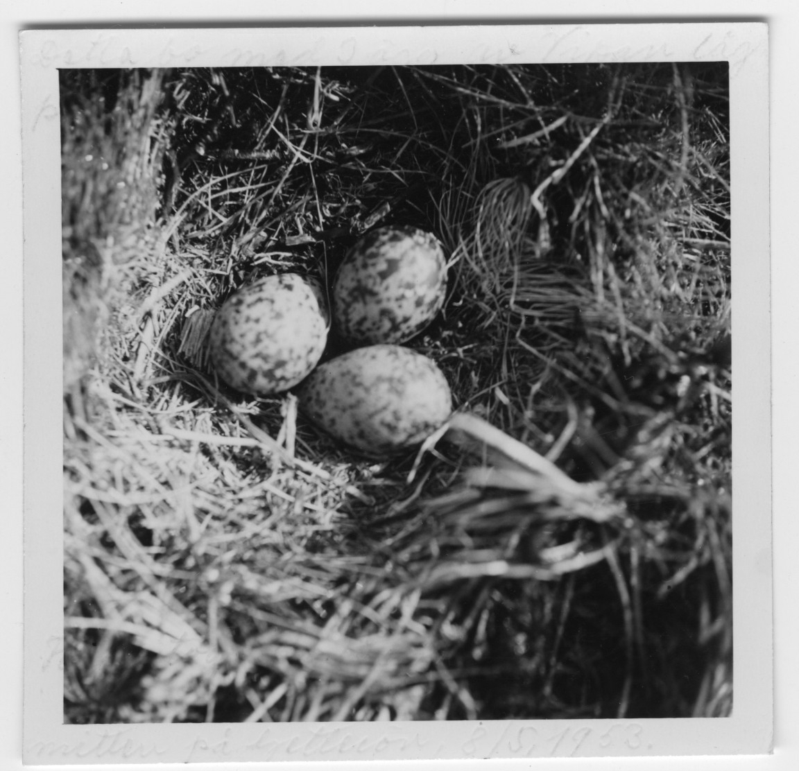 'Bo med 3 ägg av vipa. :: :: Text på fotot: ''Detta bo med 3 ägg av vipan låg på en äng vid två gölar i mitten på Getterön.'' :: :: Ingår i serie med fotonr. 4545:1-34.'