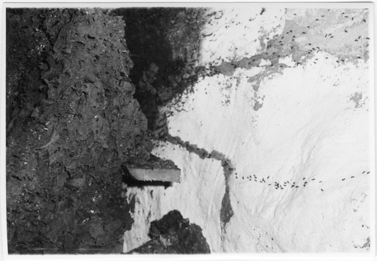 'Foton av jättebo av blanksvart trädmyra, närbild på boet och myrgångar. Boet är ett pergamentsbo med storleken, 55 cm högt, bredd 55 cm, längd i horisontalplan 63 cm och vikt 6 kg. :: :: Serie fotonr 4716-4729, se även fotonr. 5086:1-3. Samma motov som fotonr. 5086:2.'