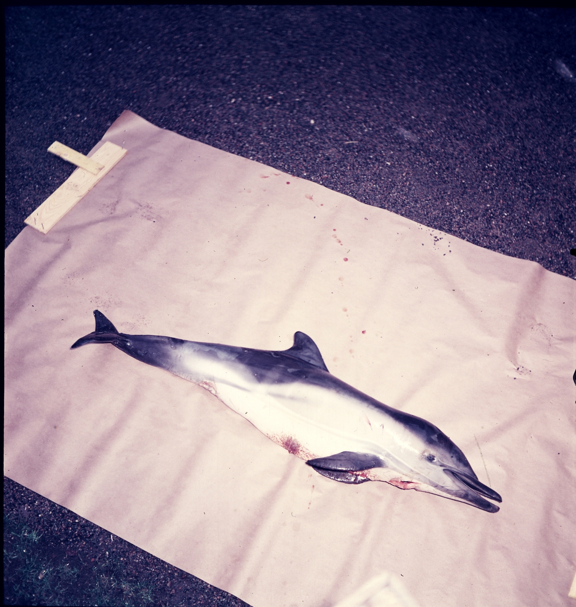 'Delfin liggande på papper på marken. Fynddatum 1957-02-17. :: :: Ingår i serie med fotonr. 4675:1-3.'