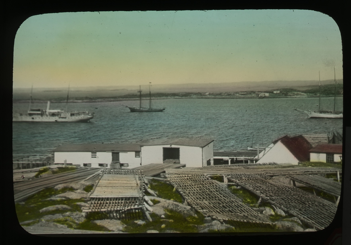 'Fiskevattnets övervakningskutter. 3 båtar i vattnet, i förgrunden byggnader.Text på glaset: ''Fisheries protective cutter.'' :: :: Ingår i serie med fotonr. 5202:1-10 med färgdia från Nova Scotia. Se även hela fotonr. 5202-5218 med bilder från Frits Johansen.'