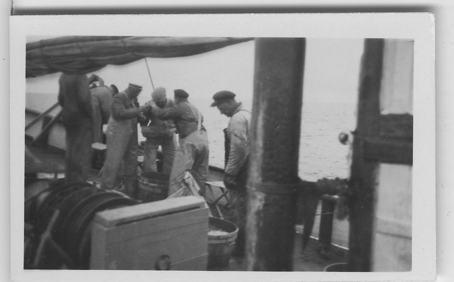 'Akkaexpedition, Bilder från Läsö och från båten (Skandia, FC51, FG51). :: :: 6 män i arbete på däck ombord på en båt. Stående runt en trätunna. Veven synlig. :: :: Ingår i serie 5089:1-63. Se även fotonr 2401-2453.'