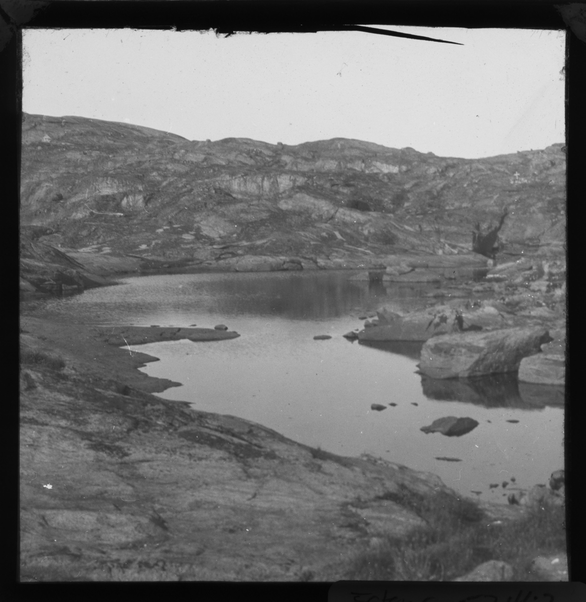 'Vy med mindre vattensamling, ev. sjö med berghällar omkring. :: :: Ingår i serie med fotonr. 5214:1-7. Se även hela fotonr. 5202-5218 med bilder från Frits Johansen.'