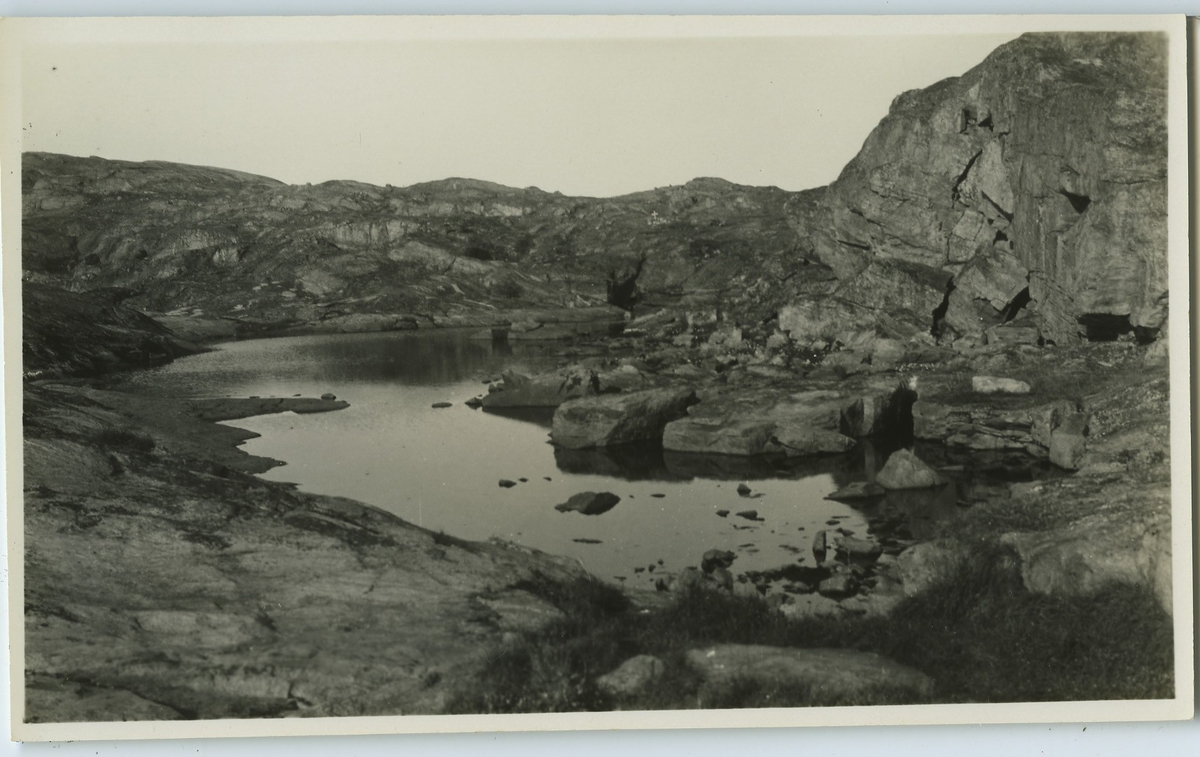 'Vattenhål omgärdat av berg och berghällar, vid Kateket-Naesset. :: :: Ingår i serie Fotonr. 5217:1-103. Se även hela fotonr. 5202-5218 med bilder från Frits Johansen.'