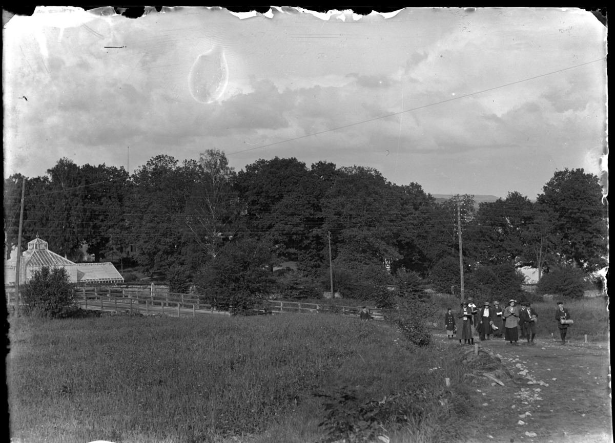 '10 personer varav 9 gående på grusväg i samlad grupp och i pojke går lite efter. I gruppen går 3 pojkar, iklädda keps, kortbyxor och bärande ihoprullade filtar, och 6 flickor, unga kvinnor iklädda hatt, långklänning/kjol och några bärande ihoprullade filtar samt uppslagna böcker. Elledning. I bakgrunden träbro som gruppen passerat samt byggnad till stor del av glas, med glastak (växthus?). Ytterligare ett hus bland trädvegetation. I förgrunden fält med vall. Se även fotonr. 20. :: :: Ingår i serie med fotonr. 5137 med diverse bilder. Plåtarna ligger i 2 pappaskar. På asken för negativen 9x12 cm och 12x18 cm står texten: ''Fröken Pettersson, Eksjö. Kopieras. Negativ. Alingsås samskola? m.m.'''