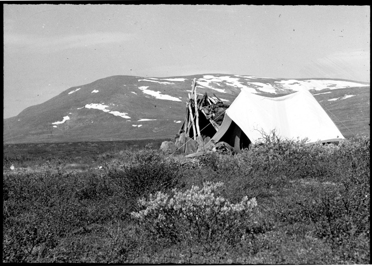 'Bildtext: ''Tjekam''. Vy med tält i förgrunden på öppen mark med busk- och risvegetation. På avstånd syns det delvis snöklädda fjället Tjekam, berg. :: :: Ingår i serie med fotonr. 5166:1-8, numrerade med bildnr 223-230. Se även hela serien med fotonr. 5155-5174.'