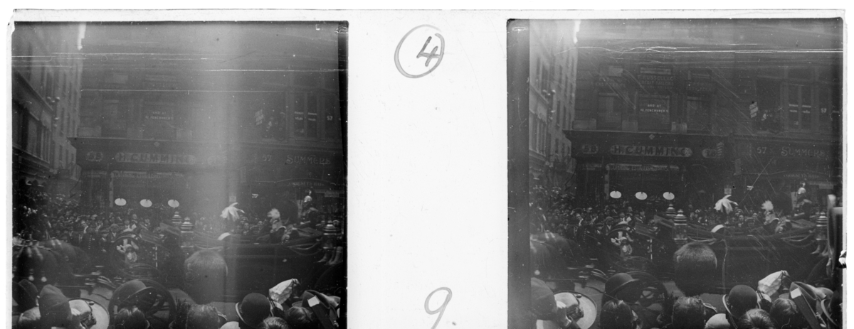 'Vagn dragen av 2 hästar med ryttare. På sidorna längs gatan stor samling åskådare. Enligt text till fotot: ''King and queen of Denmark.'' (Kungen och drottningen av Danmark.) Se även fotonr. 5245:3. :: :: Ingår i serie med fotonr. 5245:1-20, se även hela serien med fotonr. 5237-5267.'