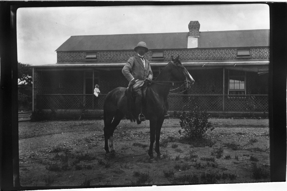 'Diverse fotografier från bl.a. dåvarande Nordrhodesia, nu Zambia, tagna av Konsul Magnus Leijer. :: :: En man på en häst, fotograferad snett framifrån, placerad framför en tegelbyggnad med veranda, på dess räcke sitter en flicka gränsle.'