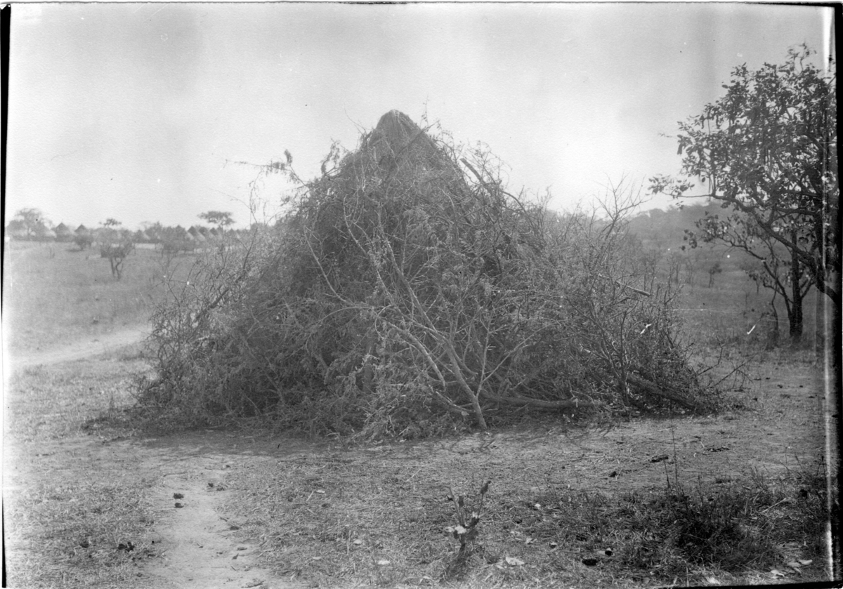 'Diverse fotografier från bl.a. dåvarande Nordrhodesia, nu Zambia, tagna av Konsul Magnus Leijer. :: :: Toppig hydda täckt av diverse trädgrenar.'