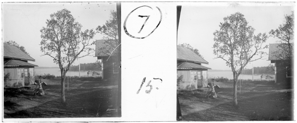 'Bildtext: ''Outlook on bay from between houses.'' (Utblick över bukten, mellan husen) :: Vy med havsbukten i bakgrunden med landningsstället för båtar invid strand. I förgrunden går 1 kvinna med hink i ena handen, mellan 2 hus med verandra. Flaggstång. :: :: Ingår i serie med fotonr. 5251:1-21, se även hela serien med fotonr. 5237-5267.'